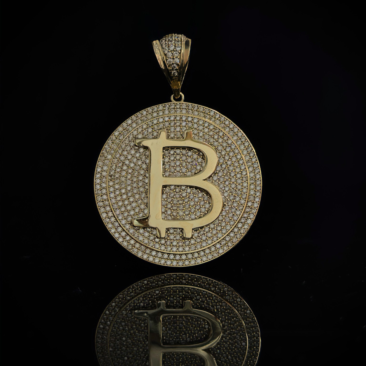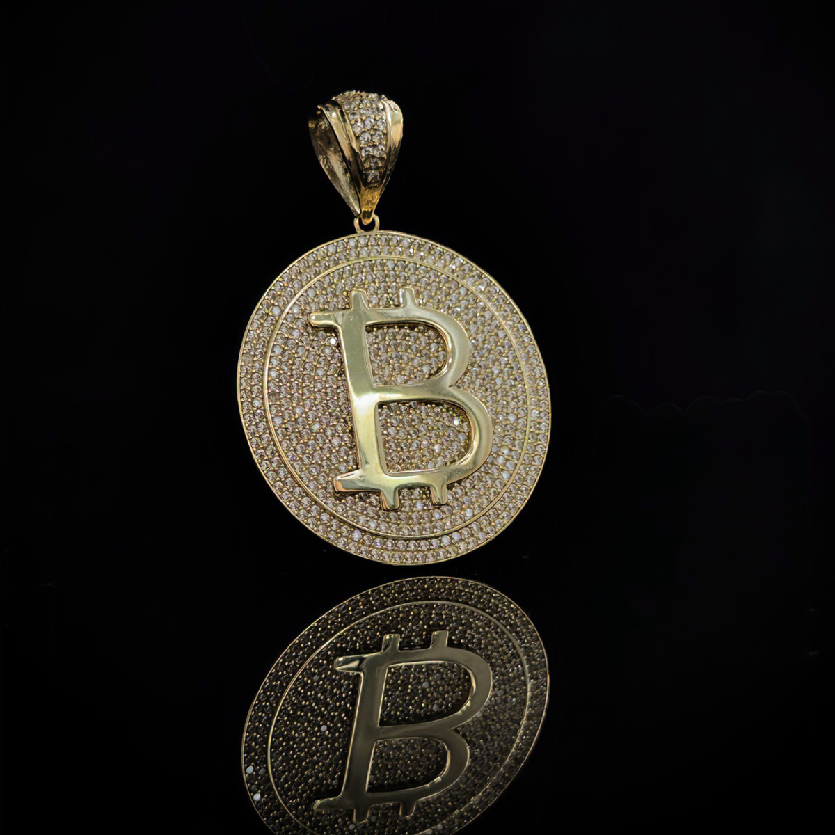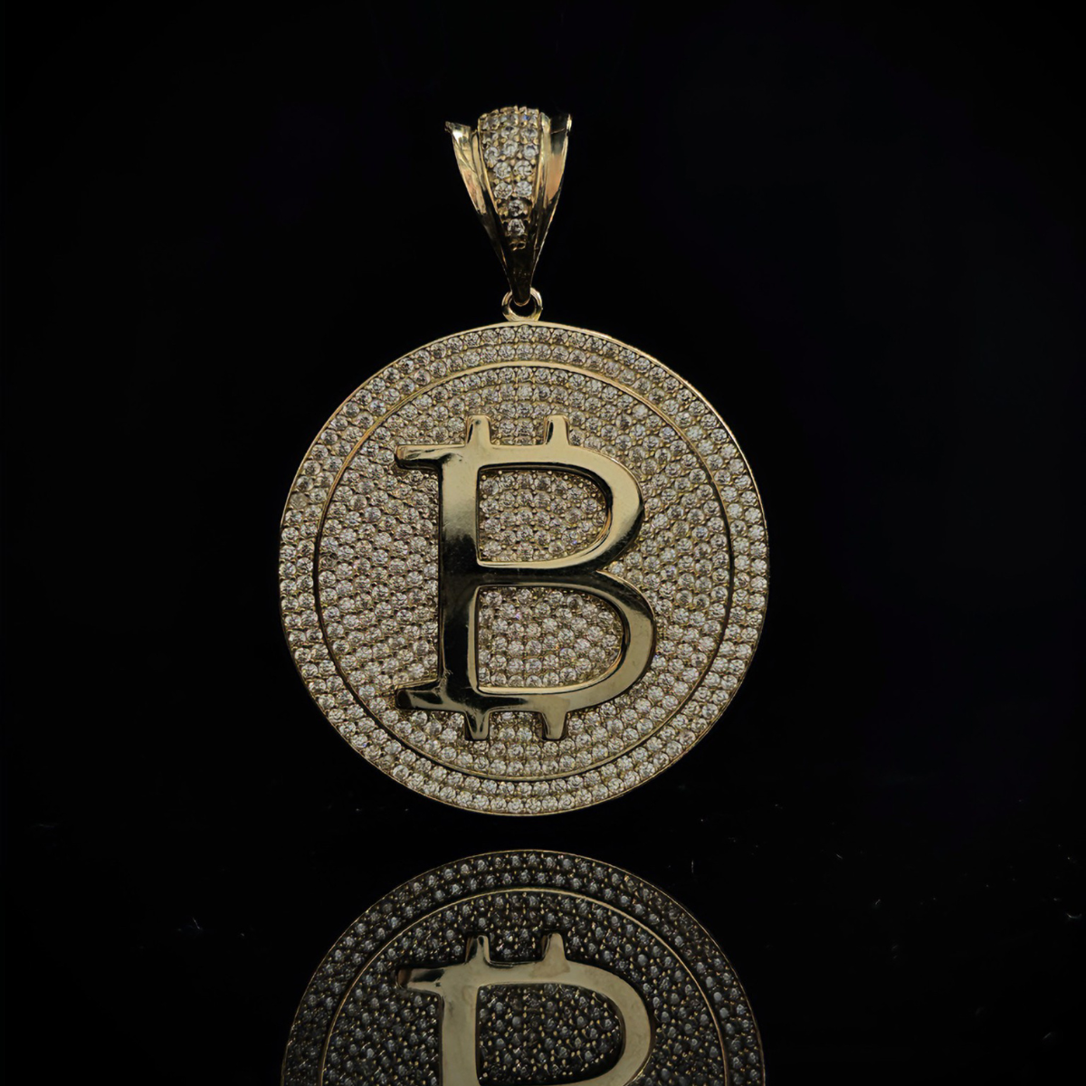 El Bitcoin en su versión más lujosa. Un dije forjado en oro 10K, engastado con zirconias de brillo superior que convierten el símbolo de la criptomoneda más influyente del mundo en una joya de colección.