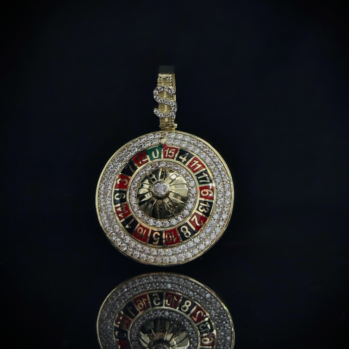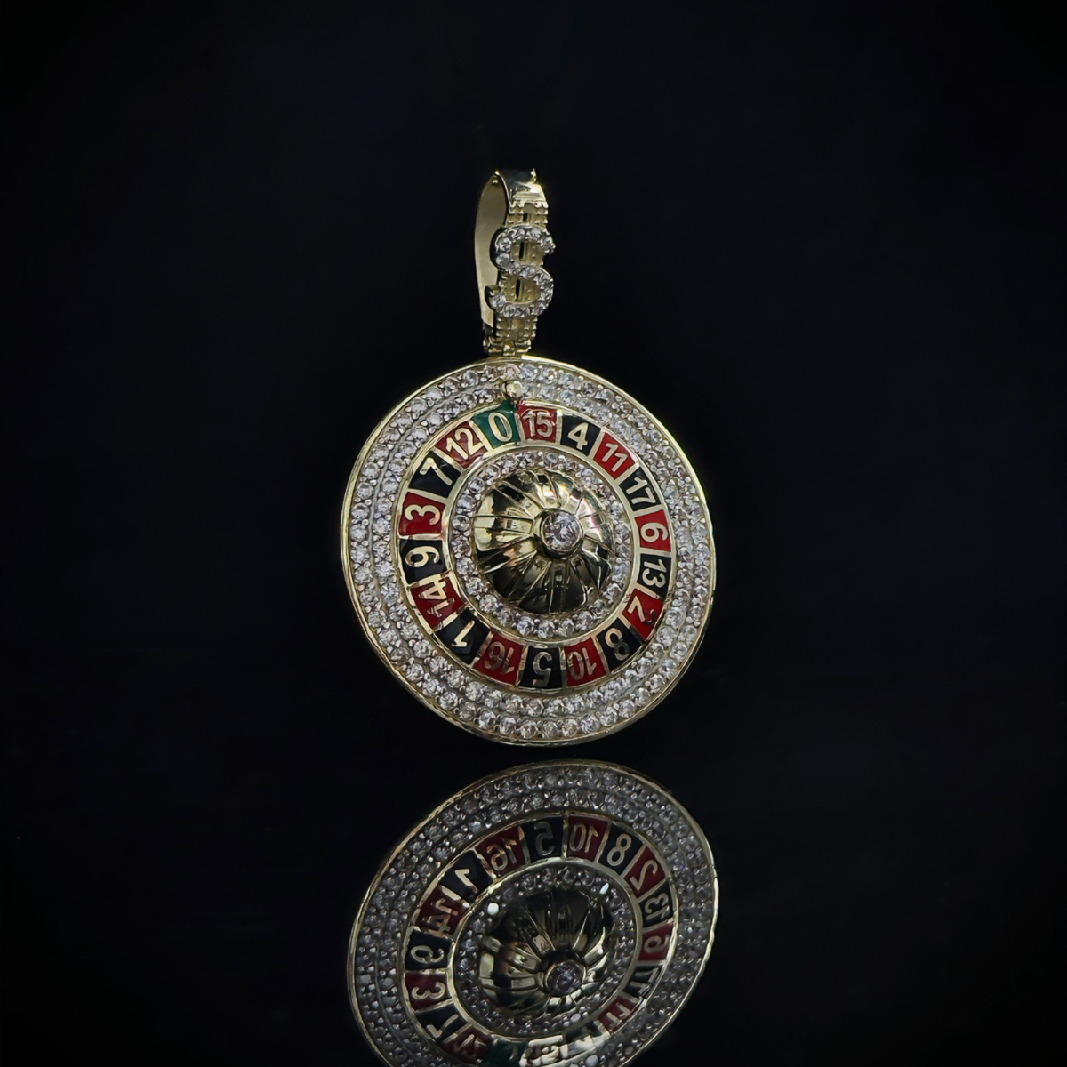 El lujo y la suerte giran en una sola pieza. Este espectacular dije de ruleta en oro 10 kilates reproduce a detalle la icónica mesa de casino, con números esmaltados en negro, rojo y verde, rodeados de circonias que multiplican su brillo desde cualquier ángulo.